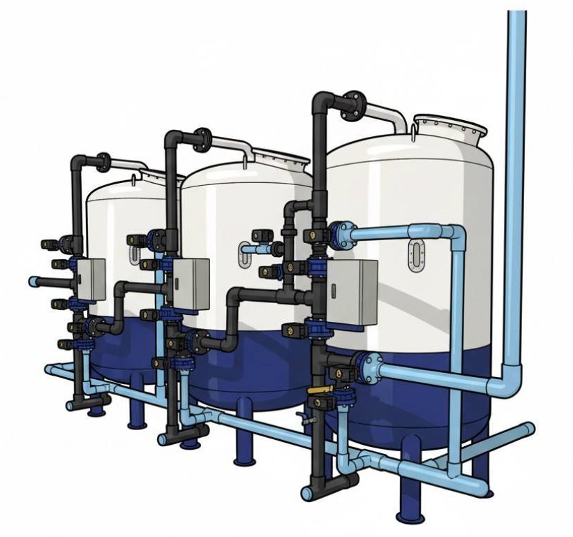 - การกรอง: น้ำกระด้างจะไหลผ่านสารกรองเรซิน (Cation Resin) ในถังกรอง
